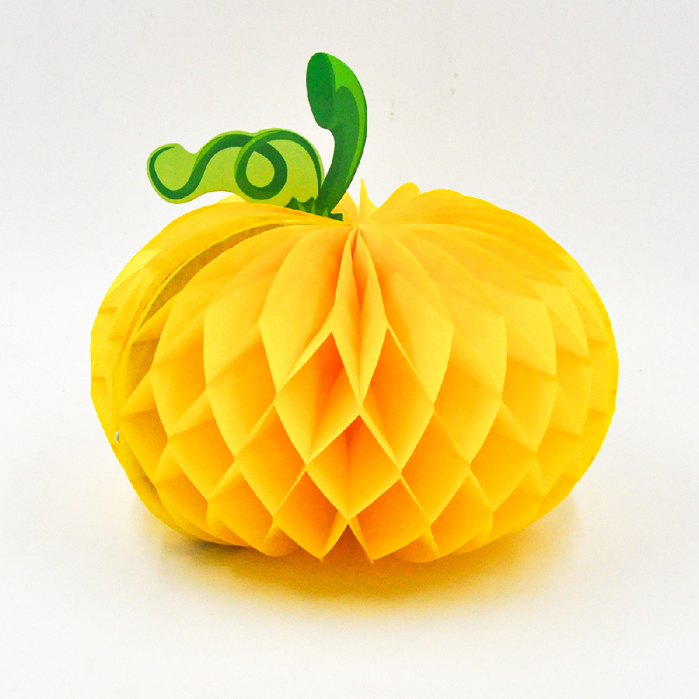 Бумажное украшение "Тыква" 20х12 см ярко-желтый — сочный и праздничный элемент для оформления стола, фотозон, витрин и интерьера. Поставляется в сложенном виде, легко раскрывается в пышную объёмную форму.