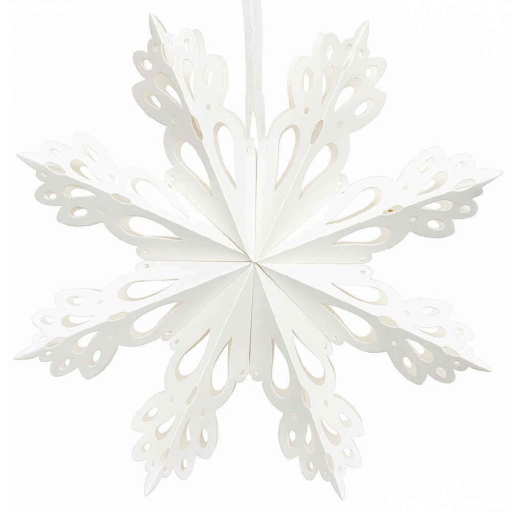 Элегантная объёмная снежинка из плотной бумаги белого цвета — изысканное украшение для зимнего интерьера, витрин, залов и новогодних фотозон. Ажурный рисунок придаёт ей лёгкость и воздушность, создавая ощущение снежной свежести и уюта.